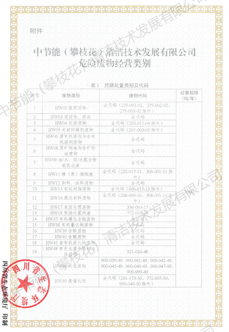 中節能(攀枝花)清潔技術發展有限公司(以下簡稱公司)成立于2008年5月,注冊資金1.6519億元。公司由中節能清潔技術發展有限公司和攀枝花市產業投資經營有限責任公司共同持股,并由中節能清潔技術發展有限公司控股經營。公司投資建設和運營的攀枝花市危險廢物處置中心項目是全國統籌部署的全國31個危險廢物綜合處置中心項目之一,位于攀枝花市仁和區大龍潭鄉迤資村華賣社,核準處理原生廢物2.425萬噸/年,可對43大類,447項(醫療廢物)進行安全處置。